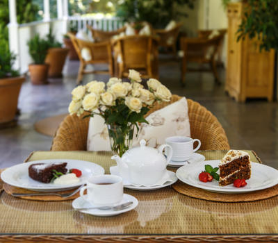 La cuina del país serveix dinars i sopars lleugers. Els àpats tradicionals es poden gaudir a la nostra piscina, jardins, terrasses impressionants amb vistes als jardins o en els nostres amplis menjadors amb patis tranquils. A l'hivern us podem reservar una taula a prop de la llar de foc.
