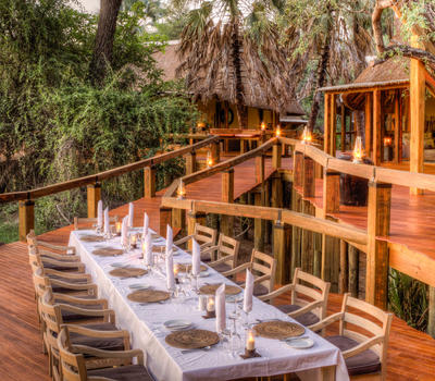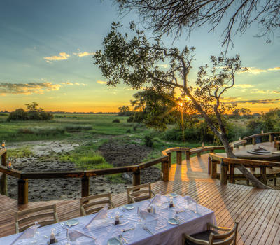 Camp Okavango’s main area comprises of a network of interconnected walkways linking up two lounge areas, a dining room, library, self-service bar and curio shop. Sweeping ramps lead to the lower level deck with two open-air fire pits and comfortable seating areas to relax and take in the natural surroundings.