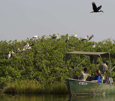 Explore the Okavango Deltaʼs crystal clear waterways by motorboat, and enjoy the magnificent variety of bird, plant and reptile species found in the area.