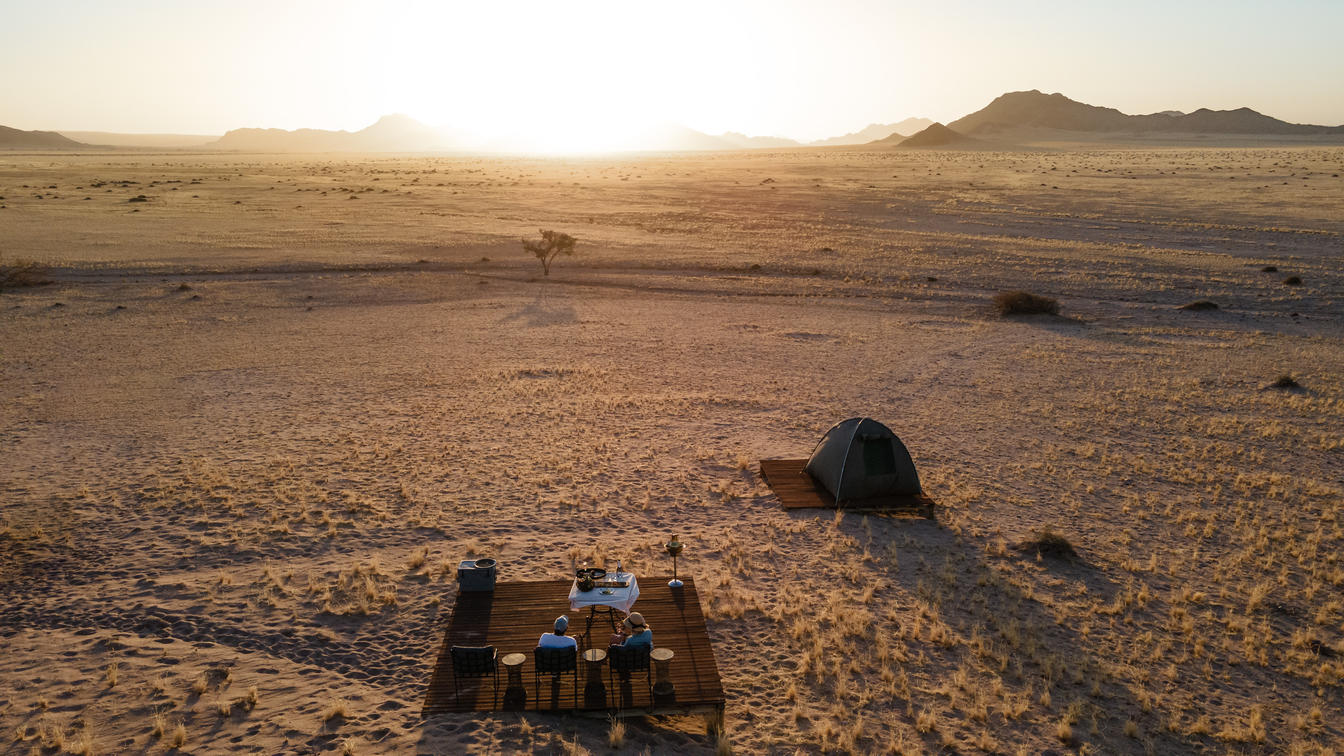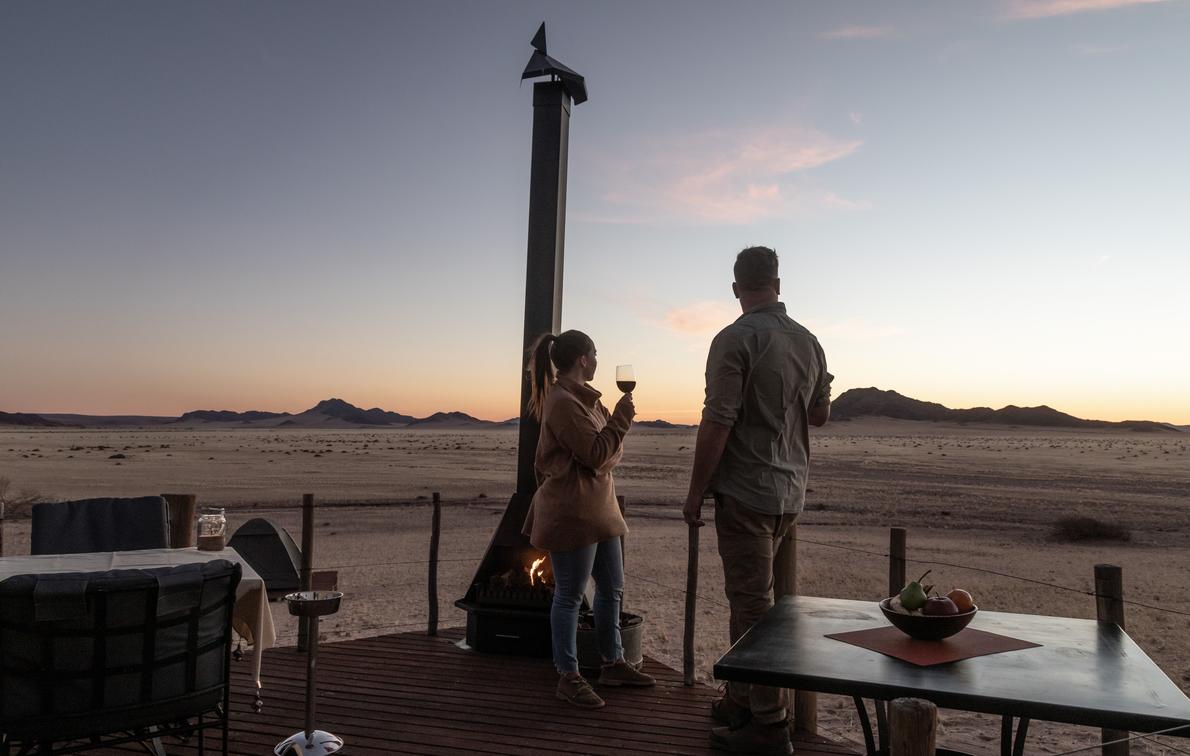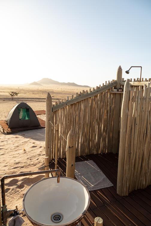 Riding takes place at a comfortable pace so that everyone feels comfortable. Slower riders can hang back while more experienced riders go for long stretched-out gallops over grassy plains while winding the way towards the tented Camp, where refreshments await for a truly remarkable sundowner with magnificent views. After watching the sunset over the majestic mountains it’s time to kick off the boots, relax and enjoy the Namibian night skies. While Dinner gets ready on the campfire true Namibian style a refreshing shower awaits.