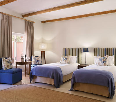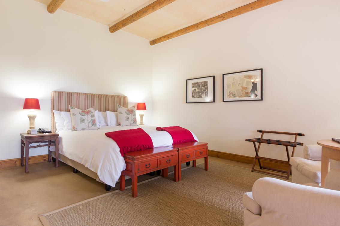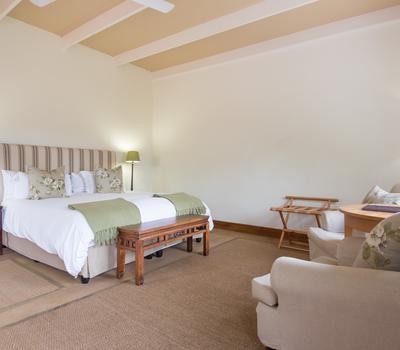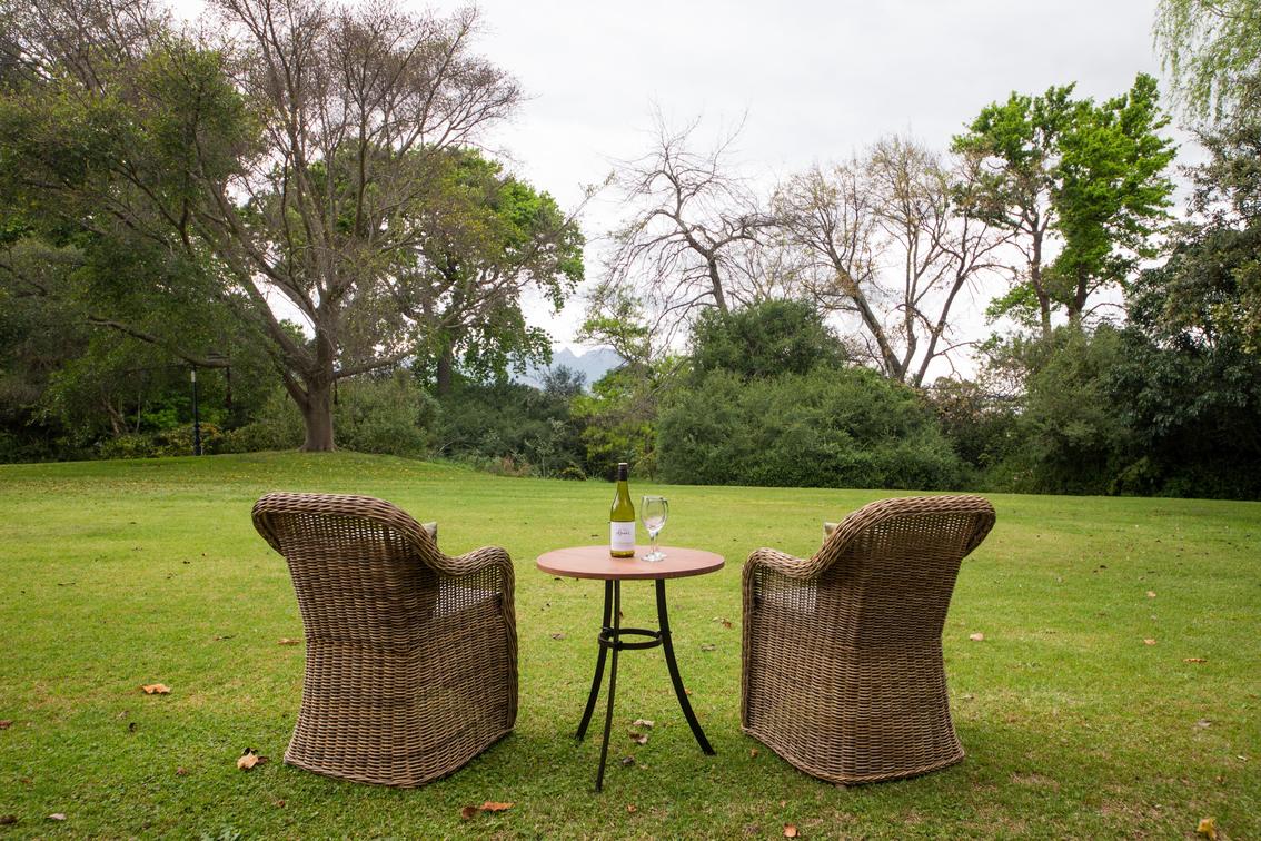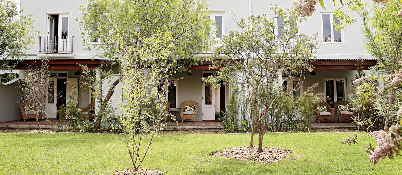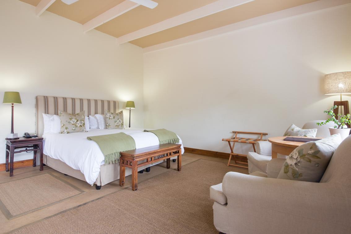 These ground floor rooms offer direct access to the lush gardens outside, with views of the Eerste River and Helderberg mountains. Their private patios are ideal for enjoying a glass of our award-winning wine in the tranquility of nature.