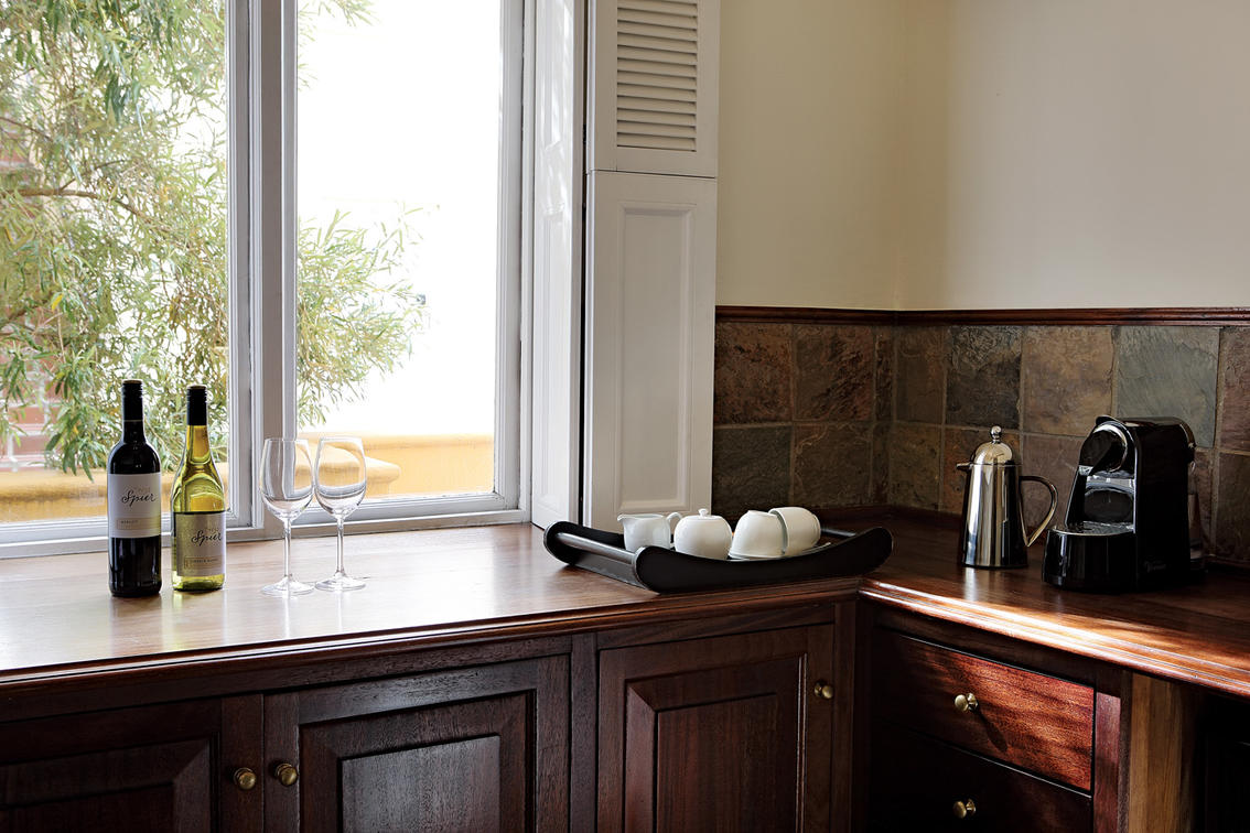 Located upstairs, the Signature Riverside rooms are light, airy and sun-filled, with views of the Eerste river below and the Helderberg mountains in the distance. Rooms are decorated with original artworks from the Spier Collection.