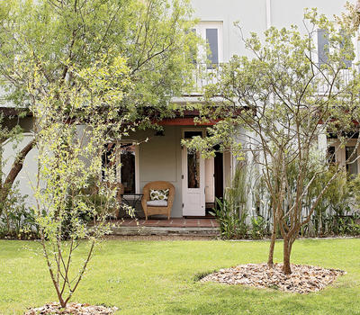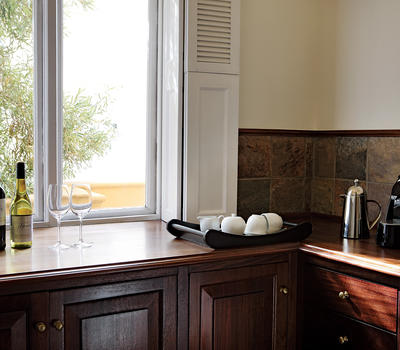 There are four suites, all individually designed and decorated. The two upstairs suites have stunning views of the Helderberg Mountains and Eerste River. The ground floor suites both open onto the gardens with a private area featuring comfortable daybeds inviting an afternoon doze with a book and glass of wine. All the suites feature top quality linen in the bedrooms and comfortable sofas in the lounge areas, with original artworks by contemporary South African artists.