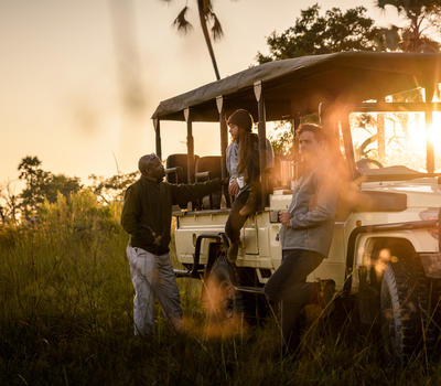 Game drives in this region are unique, as water crossings are part of the adventure, and watching zebra standing belly-deep in water, grazing, is a sight to see. Even giraffe will cross water up to their hocks. During higher water levels, game drives will be combined with motorised boating excursions and traditional dug out canoes called Mokoros. Sanctuary Stanley's Camp is set in a private concession which means we can also venture out at night on exciting game drives to see the many nocturnal animals that live here. The evening drive starts after sundowner cocktails, using a spotlight to identify nocturnal creatures including the ones that are easier to catch a glimpse of in the dark, like hyena and leopard. Tiny fireball eyes that seem to levitate through the air and reappear again in different trees are bush babies, just one of several different creatures to be found.