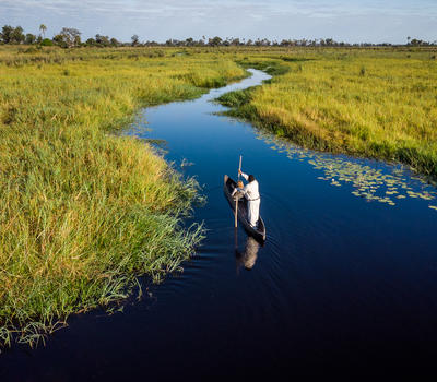 The Okavango Delta is of course flooded for much of the year and when it is, guests can experience serene silence at the gentle pace of a poled mokoro excursion along the narrow channels. Sit back and relax as you glide through lily ponds on local dugout canoes while seeing eye to eye with a buffalo as it laps water from the river, watch crocodiles sunbathe on the banks or cruise past a pod of hippos as they lie in a pool. Fish eagles, frogs and fabulous lilies form much of this experience, but more frequently it is the quietness and gentle pace that makes its impression.