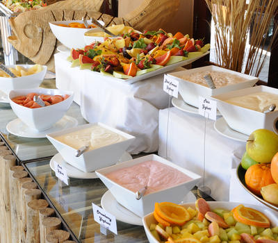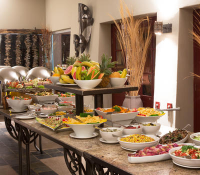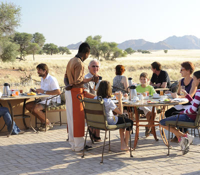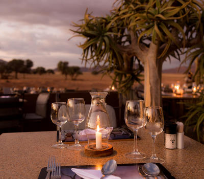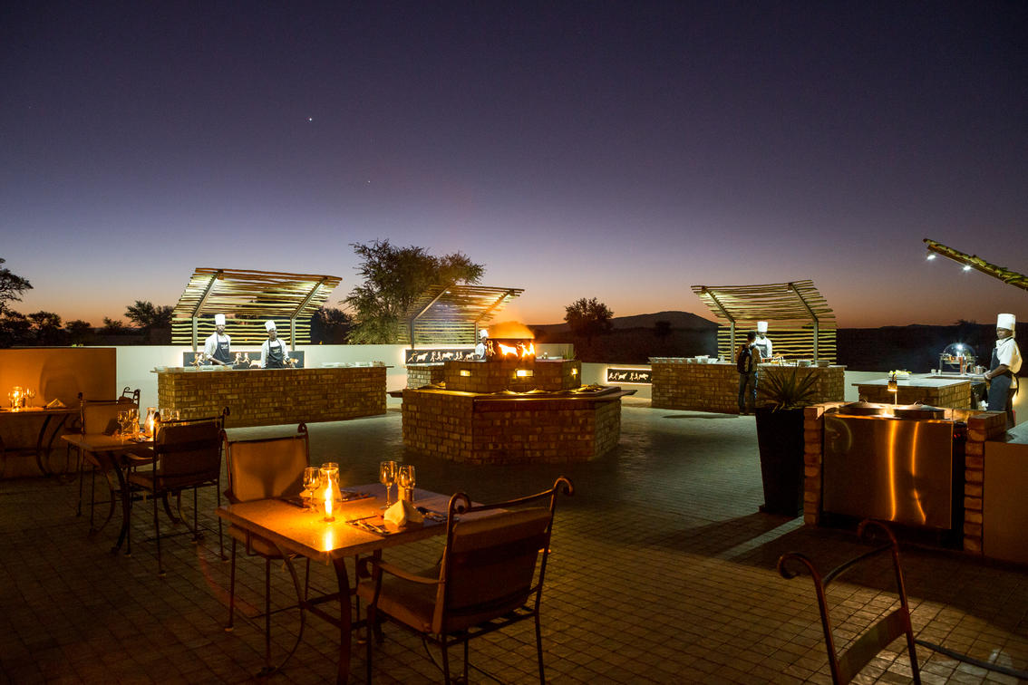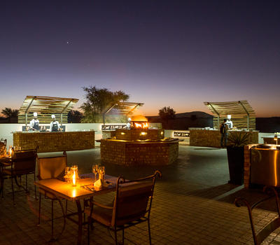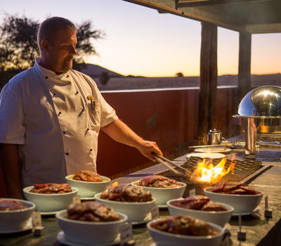 Sossusvlei Lodge is well known for sensational cuisine and many guests have praised especially the delectable buffet dinner experience. The al fresco terrace offers magnificent views over Elim Dune and of the floodlit waterhole where you can watch the passing parade of oryx, springbok, jackal, ground squirrel and hyena, whilst enjoying exquisite food and wine. You can start your day with a scrumptious buffet breakfast with an extensive selection of all the favourite delectable breakfast foods and treats. For lunch the chef will spoil you with the mouth-watering meal of the day accompanied by a variety of salads and side dishes. An a 'la carte menu is available at the Sossusvlei Lodge Bar from 14h30 to 16h00. The popular buffet dinner will leave you spoiled for choice between the salads, side dishes, grilled meats and stir-fries - all prepared fresh and in front of every guest! For the perfect ending there is a range of decadent dessert sensations as well as a variety of cheeses and biscuits.