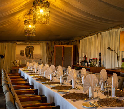Our spacious dining tent allows guests to enjoy their meals whilst enjoying views of the Acacia Forest stretched out infront of them. Meals are communal allowing everyone to catch up on the days experiences, meet new friends, share experiences all whilst being attended to by our dedicated team. Meals are varied to suit all tastes but if you have any dietary requirements let the camp know and the chefs will whip up some specials.