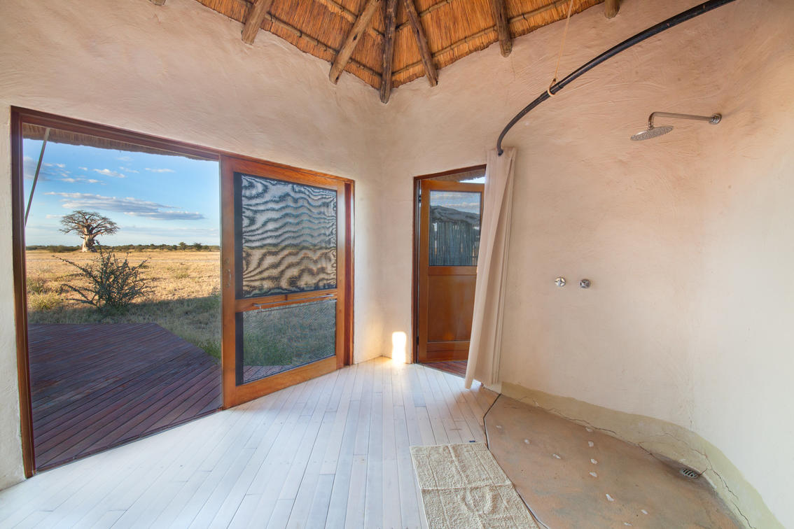 The minimalistic white-washed design of the camp is in keeping with the surrounding white salt pans. Nxai Pan accommodates up to eighteen people in nine environmentally designed units. All are built with materials of minimal environmental impact and additionally maintain a constant and comfortable in-room temperature year-round, while seasonal temperatures vary from below freezing to over 40 degrees Celsius.