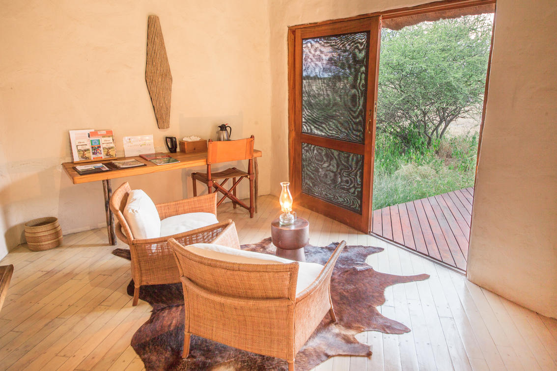 The rooms include double wash basins and both indoor and outdoor showers. The rooms are spacious with lounge area and one includes an additional twin bedroom, ideal for family use. All the units are on raised decks and their location on the edge of the ridge means that each viewing deck has truly special and captivating views of the wide open pan and its big beautiful sky. Each hasan open verandah which looks on to the waterhole in front of the camp, where elephant are frequent visitors.