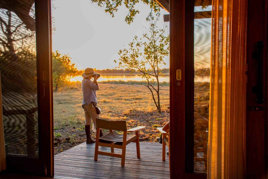 The communal area at the center of the camp consists of the dining area, lounge, and safari shop, with two swimming pool areas (with loungers and a small bar) at either end of the camp.