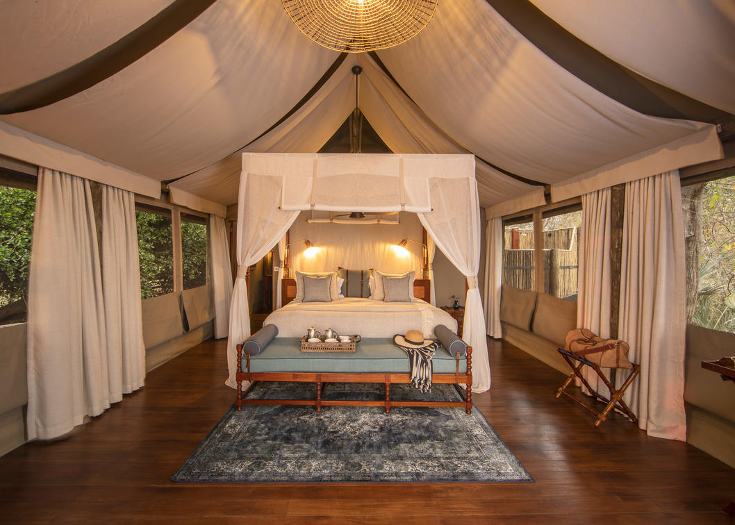 Guests are accommodated in a spacious, safari tent consisting of two bedrooms, shared en-suite bathroom with indoor and outdoor shower, hot and cold running water and flush toilet. The tents are well spaced, affording privacy whilst remaining within comfortable distance from the main camp area. Roomy enough to sleep a maximum of 5 people. Shinde takes children from the age of 7 years old.
