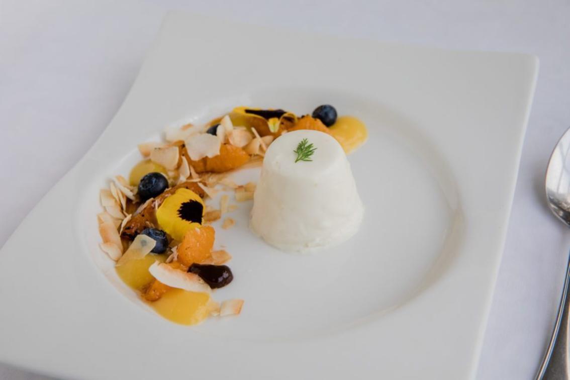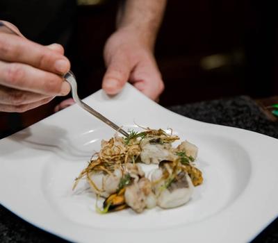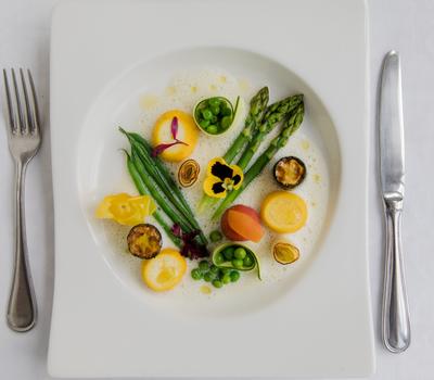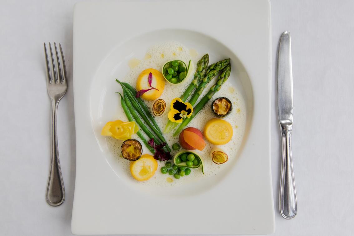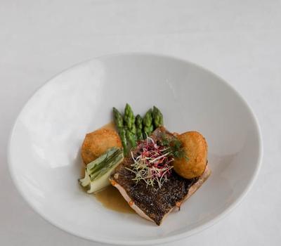 Vegetarian main options include Fried Halloumi with Spring Onion Croquette and Wild Mushroom Risotto (Vegan) while Pescetarian options include Local Trout with Asparagus, and Sustainable Line Fish, Coriander Endives with Vanilla Butter, Sweetcorn, Lime and Grapes. Chef Jason is a huge advocate of nose to tail eating and he applies this principle to vegetables too. Nothing in the kitchen is wasted. The skin and offcuts from the trout are used in the fishcakes, for example.