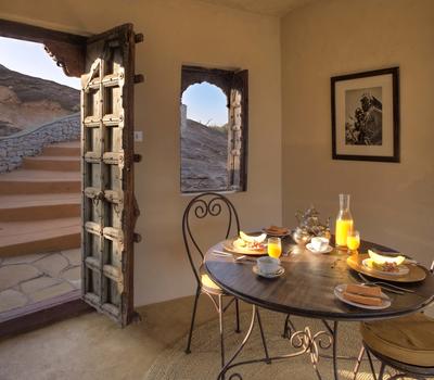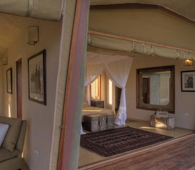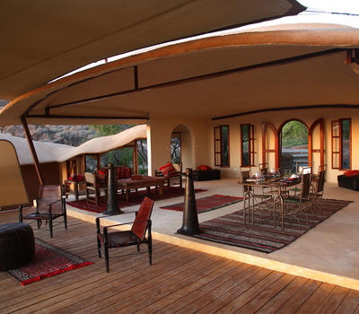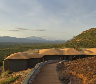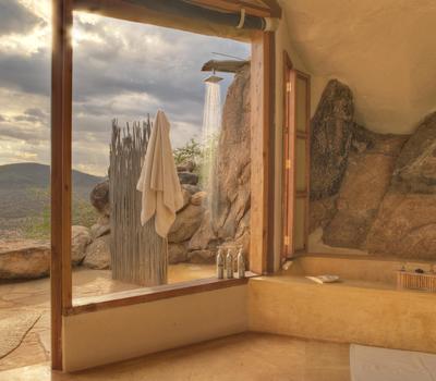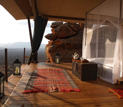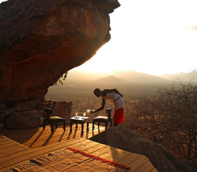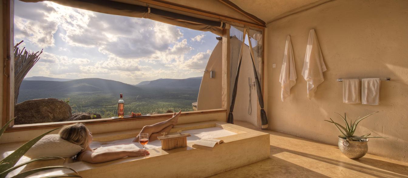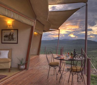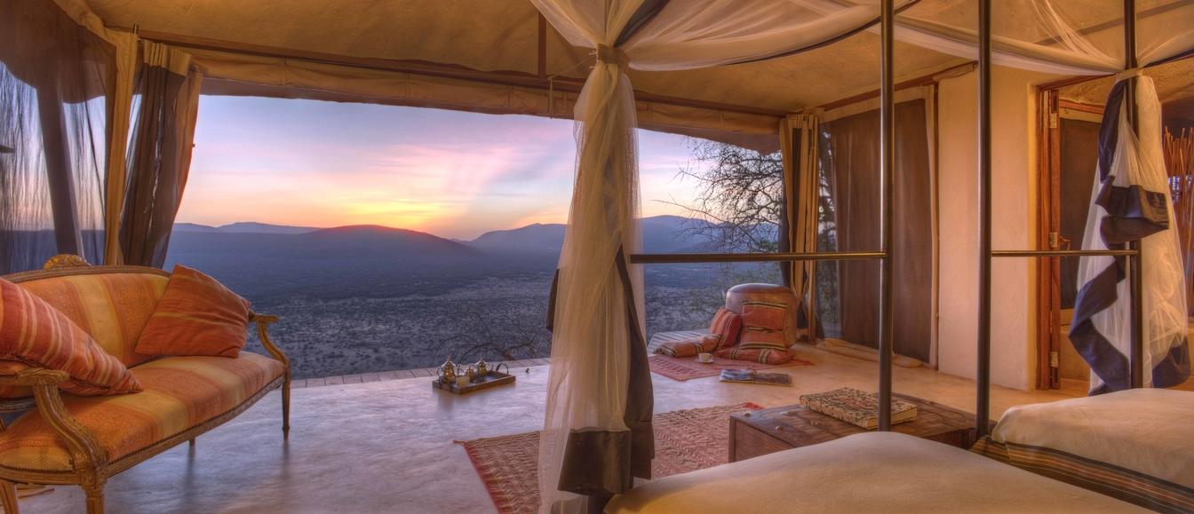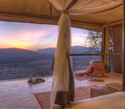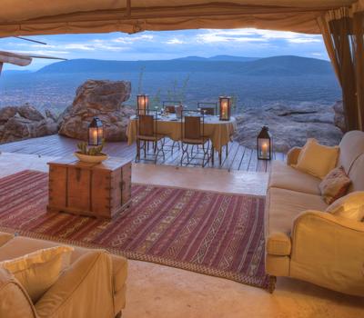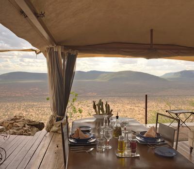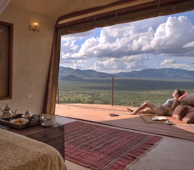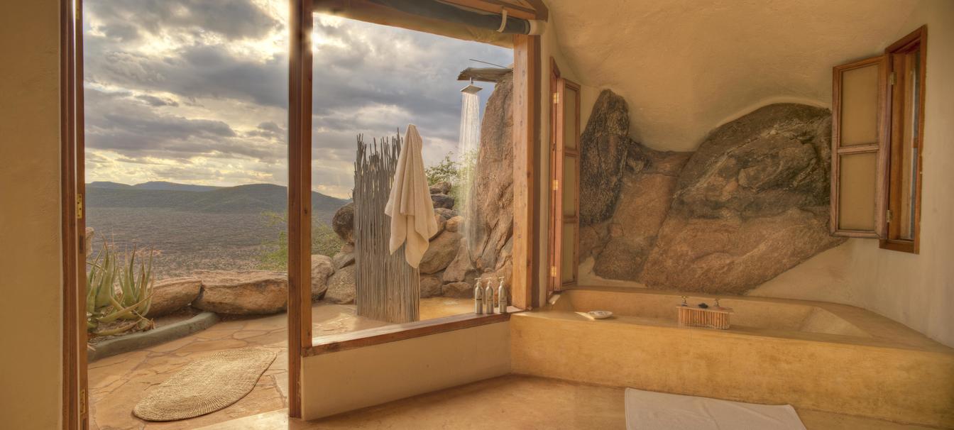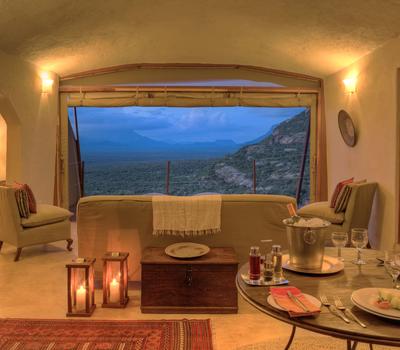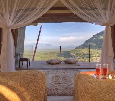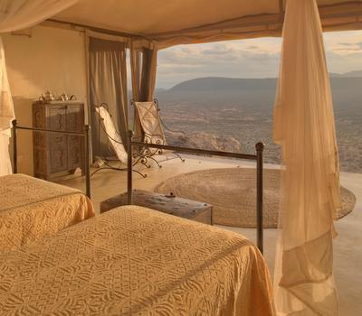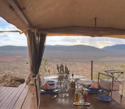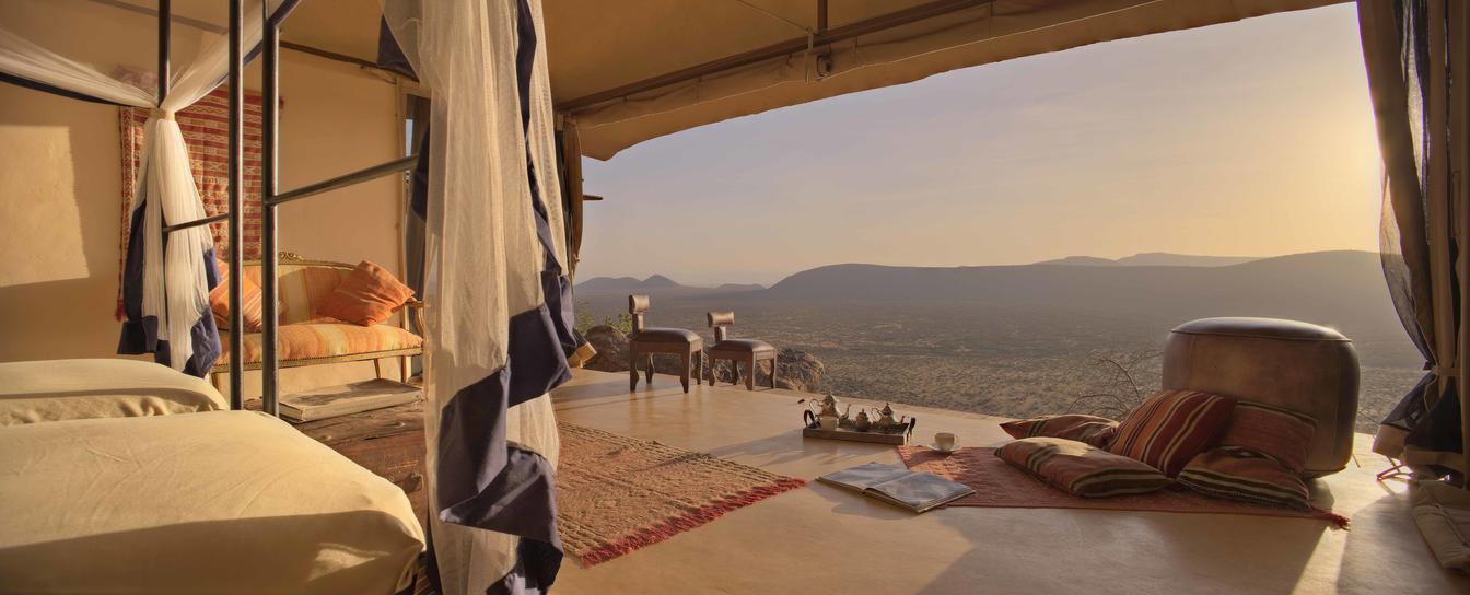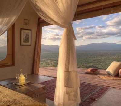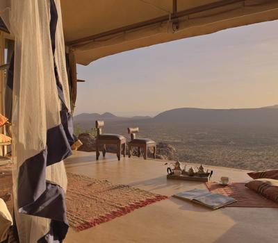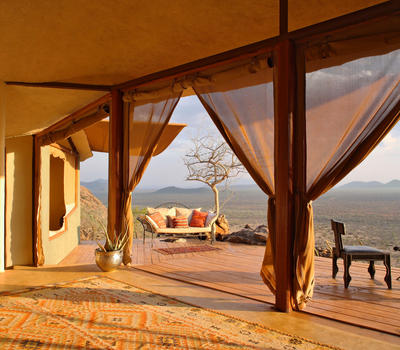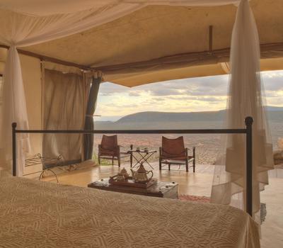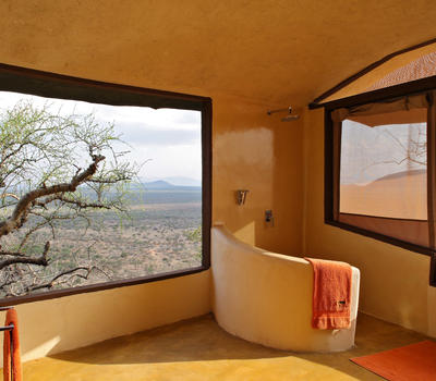 Villa Six, can be used as a large family villa with two separate bedrooms and two spectacular bathrooms with both indoor and outdoor showers. Or, the villa can be segregated into two separate entities for two different groups of guests. Each villa has a spacious living and dining area for private dinners, large veranda with the most magnificent view of the Northern Frontier Mountains, and a fridge stocked with cold refreshments. Perfect for families, groups of friends or for two separate groups of guests, Villa Six has a completely unique view different from any other accommodation throughout the lodge; its innovative location, the Swahili touches and the stylish furniture make it one of a kind.