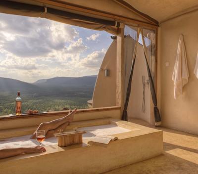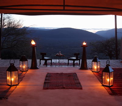 Villa Five is a standard villa and is known as Saruni Samburu's honeymoon villa. With an open and spacious bedroom and spectacular en suite bathroom with a bath tub and shower, Villa Five is a perfect romantic escape. The villa has a spacious sitting area and dining area for private candle-lit dinners, an open and secluded veranda, and a fridge stocked with cold refreshments. Perfect for couples, Villa Five is suspended over Samburuland with incredible panoramic views.