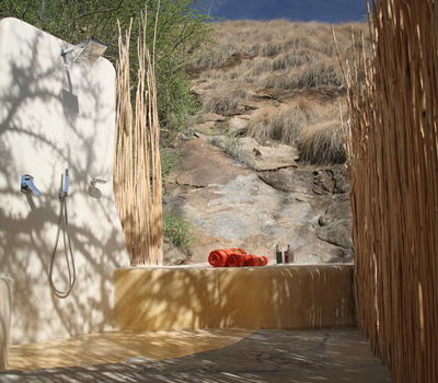 Villa Four is a large family villa with two separate bedrooms and two spectacular bathrooms with bath tubs and outdoor showers. The villa has a spacious sitting area and dining area for private dinners, a large and open veranda overlooking your own secluded and speculator view of Samburuland, and a fridge stocked with cold refreshments. Perfect for families or a group of friends, Villa Four is beautifully decorated and designed to blend into the natural surroundings.