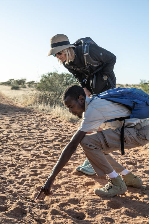 Enjoy an African Braai at the campfire on a dune before listening to the sounds of the night, either in a tent or even outside under the starry sky. In the morning, shortly before sunrise, grab a hot cup of coffee and watch gnus and zebras on the water hole before experiencing that magic moment when the sun comes up in glittering gold just behind the dunes. All of a sudden, the temperature turns comfortably warm, the night is over, a new day has begun. Africa. The Trans-Kalahari Walk perfectly combines a comfortable stay at the lodge with exhausting but rewarding physical activities and campfire romanticism in the Kalahari dunes.