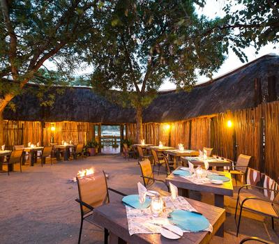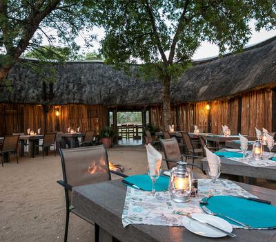 Guests dine together in the open-air boma when they stay at Umkumbe. The tables are centred around a campfire, which is often the hub of activity after dinner. Rangers will often come and sit with guests to answer questions about the day's safari.