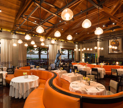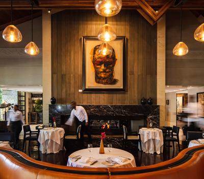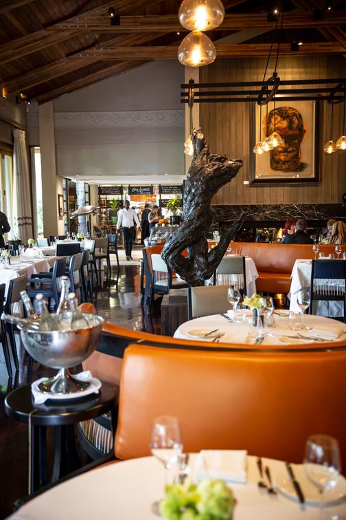 Inside, the David Collins Studio designed interiors include curving orange leather banquettes and handpicked art. Come join us for a unique dining experience in the exquisite setting of Delaire Graff Estate.