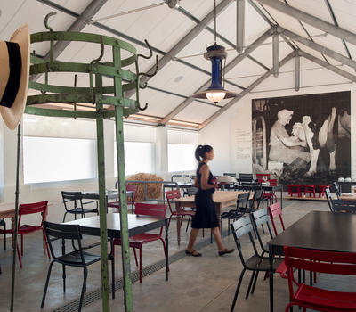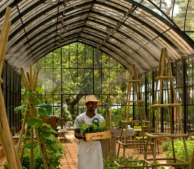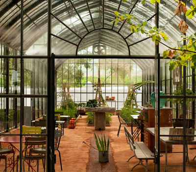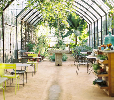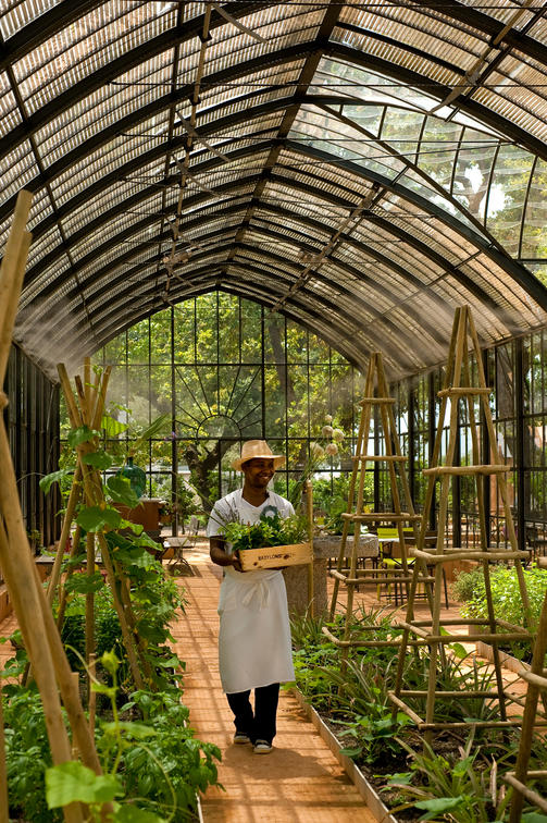 The 26 metre vintage conservatory in dark green steel was custom built for Babylonstoren in France by Serres et Ferronneries d'Antan. Paired with a collection of brick-red tables and colourful green Luxembourg chairs (the classic park chair design), the Greenhouse is a surprising but thoroughly logical refreshment station for guests who have completed the garden tour.