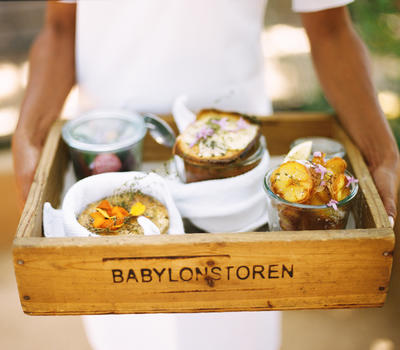 The Greenhouse menu subscribes to the self-same "pick, clean and serve" philosophy as Babel, with a strong emphasis on honest food with little to no fuss. All our food is served picnic-style in wooden crates with the preserves, jams and salads packaged in weck jars, while fresh bread from our wood-fired oven come wrapped in the iconic blue-and-white Babylonstoren paper.