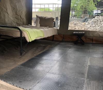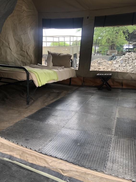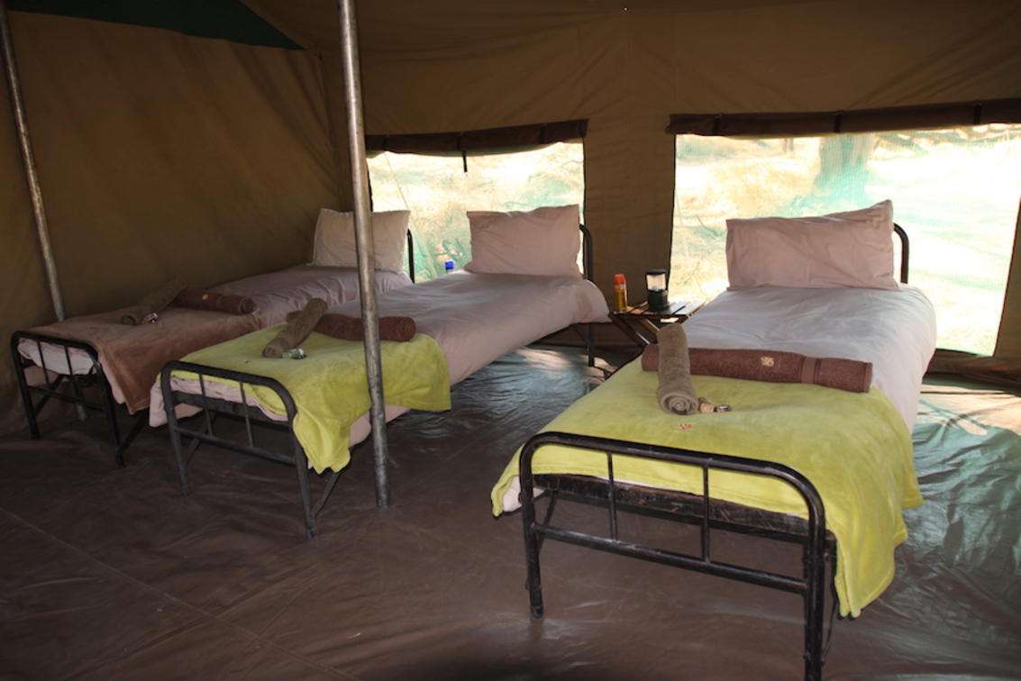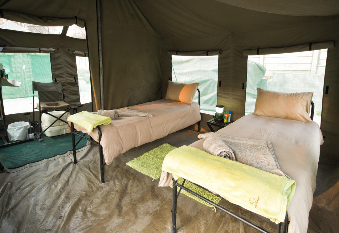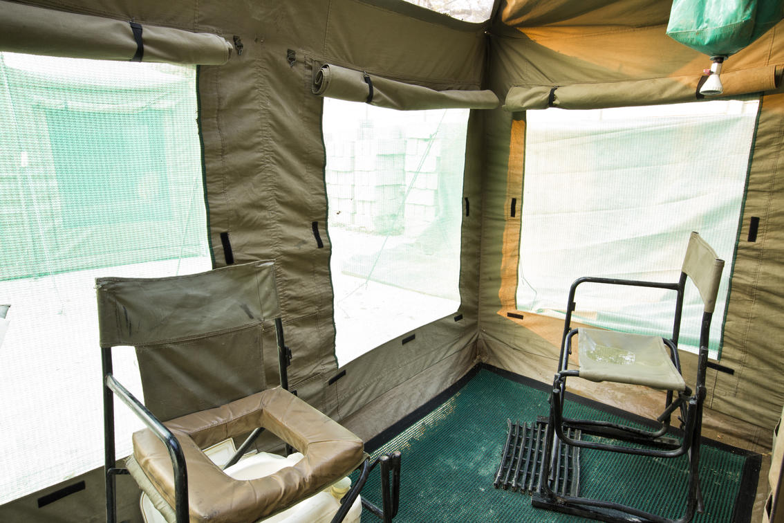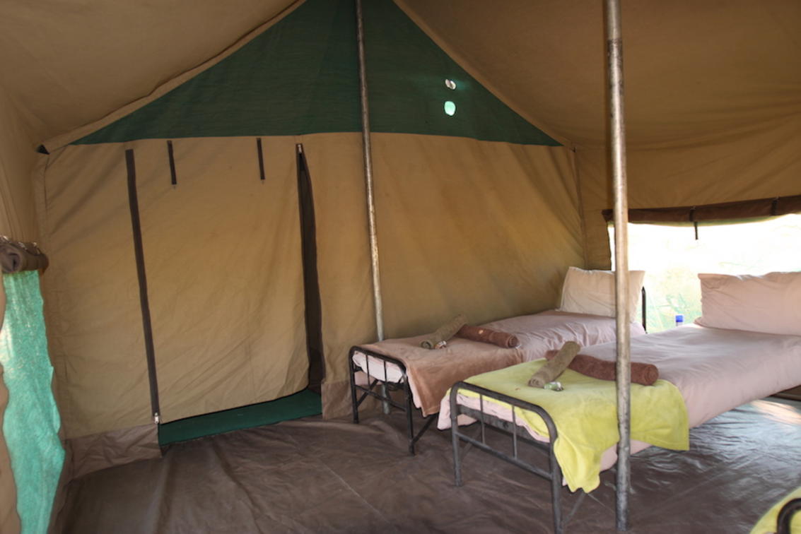 Between the beds there is a small table with a light and rechargeable battery. At the entrance of the tent there is a water container which is filled by our staff every morning and evening to wash your hands and face and clean your teeth.