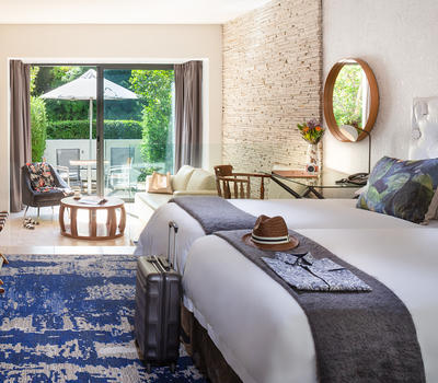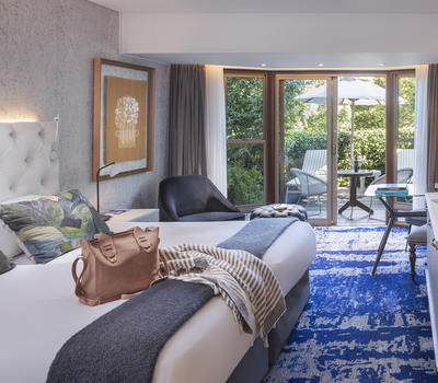 At the north end of the estate, Garden Junior Suites are restfully styled spaces with deluxe bathrooms with separate showers and baths. The bedrooms step down to cosy lounge areas and private garden patios. Each Junior Suite is equipped with a flatscreen, a queen bed, a hairdryer, a wall safe, Nespresso Coffee Machine and DVD player.