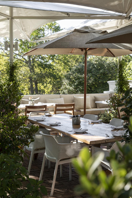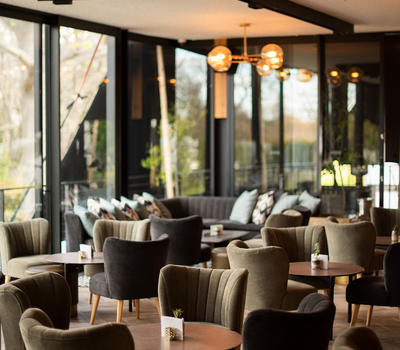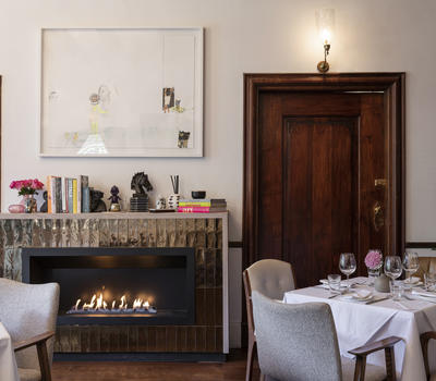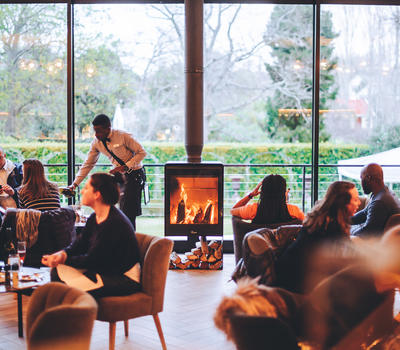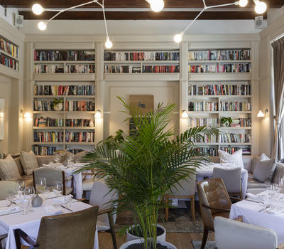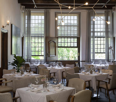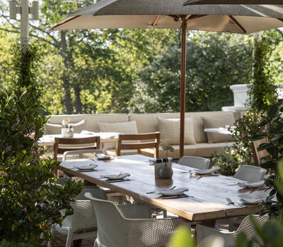 Dine inside in an intimate and refined yet cosy setting, or enjoy terrace dining under the oak trees.