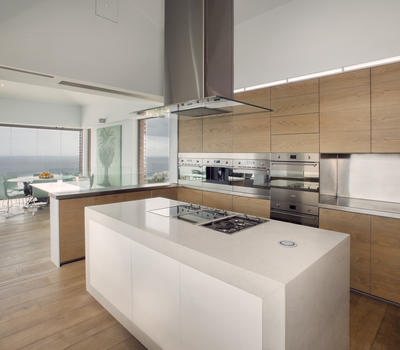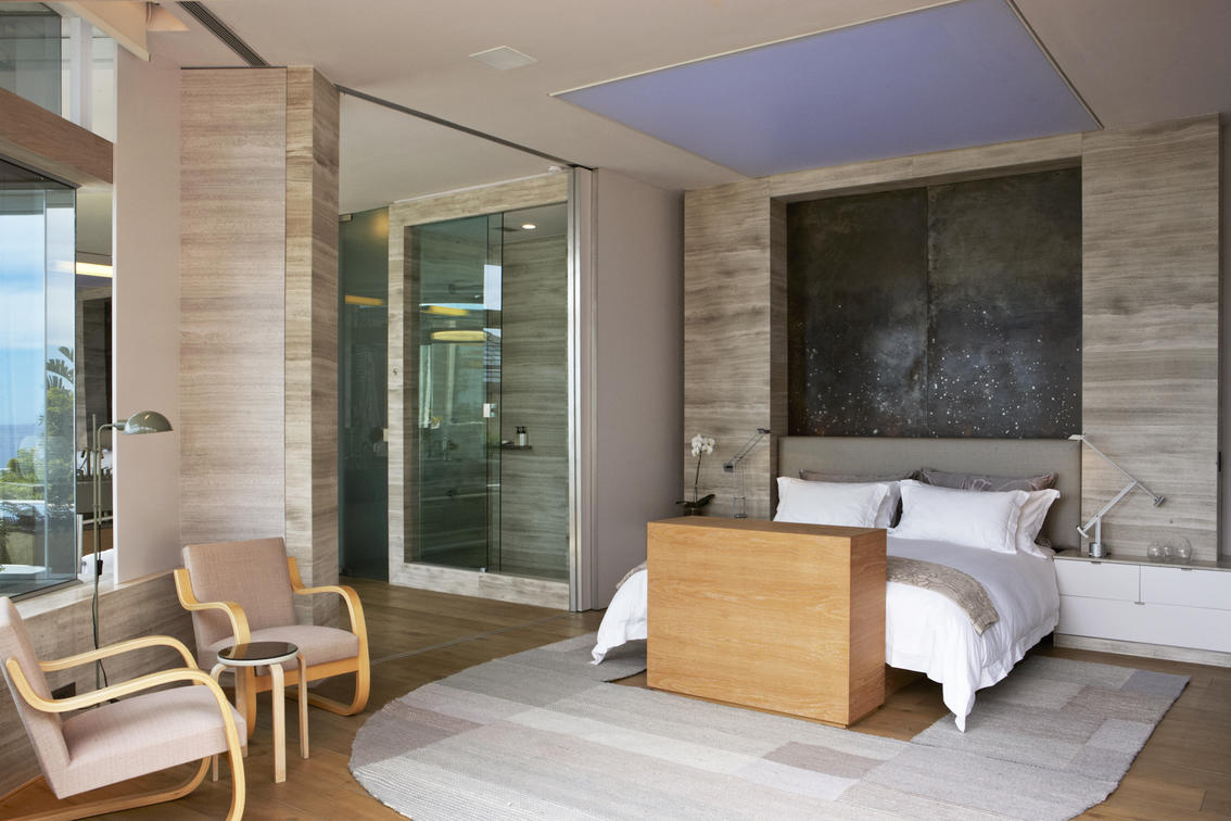 The top floor (street level) includes a glass-walled entrance foyer that opens up into light-filled living, dining and entertainment areas decorated in soft, soothing sea tones with natural stone and unembellished wood finishes. Fold-away, floor-to-ceiling glass doors on two sides seamlessly integrate the indoor and outdoor entertainment areas, infinity pool, and spectacular ocean views. To the right of the entrance foyer is an open-plan kitchen designed for social, interactive cooking equipped with a large central island, sleek timber cupboards, a separate scullery and walk-in cold room. The kitchen may be closed off from the dining area by a sliding panel. A personal chef is on call to create breakfast, lunch, snacks, and dinner. The emphasis is on fresh, locally sourced and seasonal ingredients. Any dietary needs or restrictions, food allergies or children’s meals may be discussed with the chef.