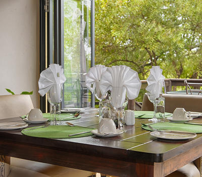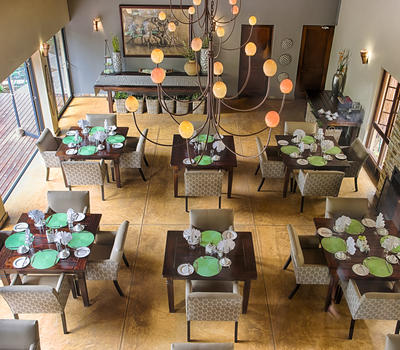 Breakfast and lunch are served in the dining room, or on the pool deck overlooking the open area.