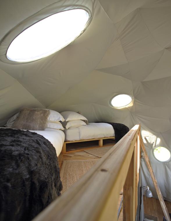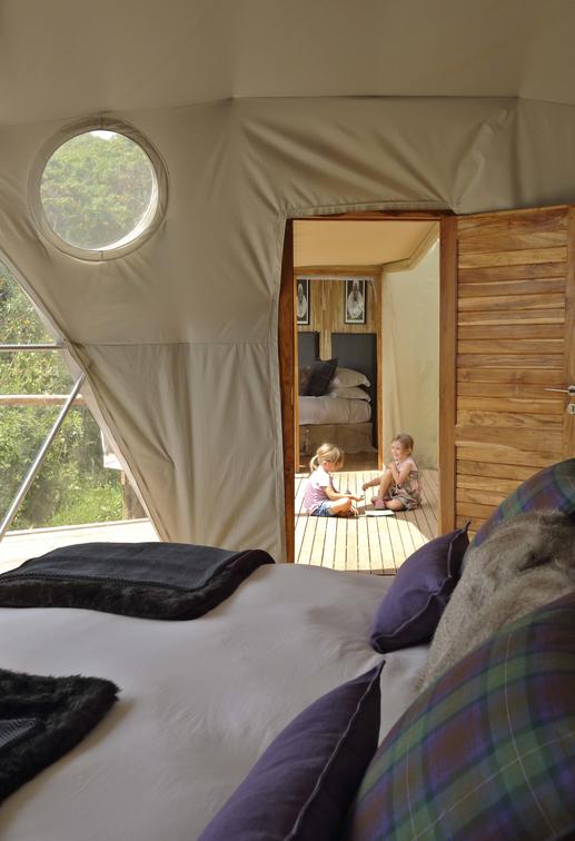 The Highlands features one family tent specifically designed to accommodate two adults and two children. The main dome is a standard double with a covered walkway leading to a smaller dome with twin beds and en-suite shower room for the children.