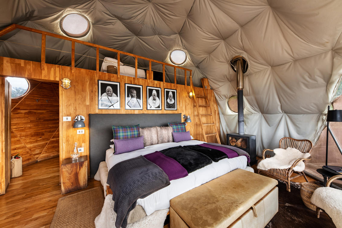 The Highlands has six large, luxury guest tents with fantastic views stretching to the Gola Mountains. The domes have the option of being twins or doubles with several having a mezzanine available for a third bed. The tents all feature king-sized beds, en-suite bathrooms with separate flush toilet and double-headed plumbed shower. Each tent also has a wood burning fireplace and plenty of cosy blankets and rugs for warmth in the colder months.