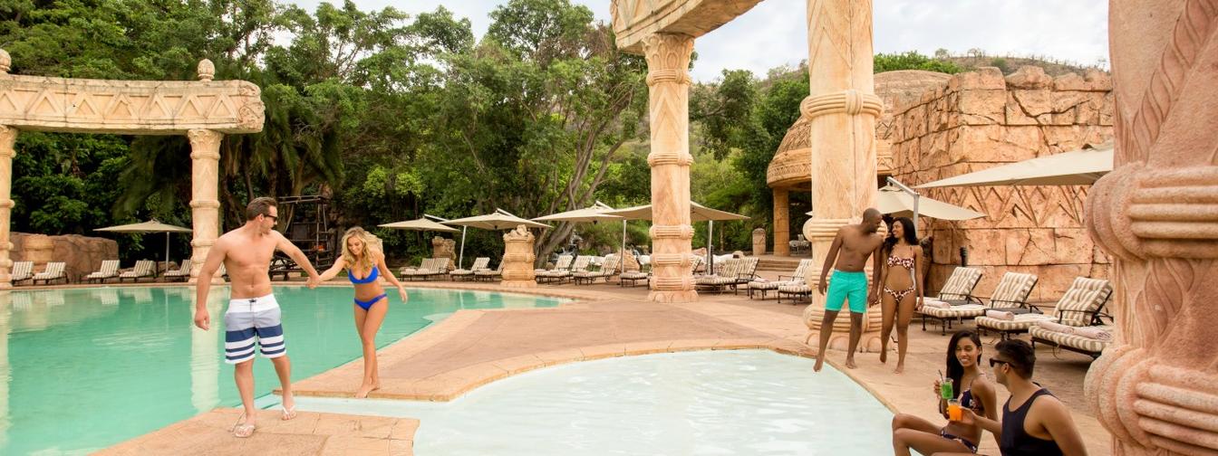 This private adult pool located above The Brew Monkey at the Valley of Waves will inspire you to dive in and swim laps. Surrounded by lush jungle, The Royal Baths is also the perfect place to unwind after an active day at Sun City. - Operating hours: 08h00 - 19h00 (Valley of Waves times – peak periods) thereafter it will be open as per normal Valley of Waves times - Free entry to all hotel and Sun Vacation Club residents on presentation of their resident cards - Day visitor entry fee: R50 (guest will receive an armband for identification) - Complimentary fruit skewer - Complimentary non-alcoholic cocktail - Guest to present ID on request - Max capacity: 200 people - Gazebos are available for private massages - Observatory Bar is exclusively for guests at The Royal Baths