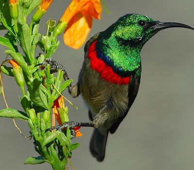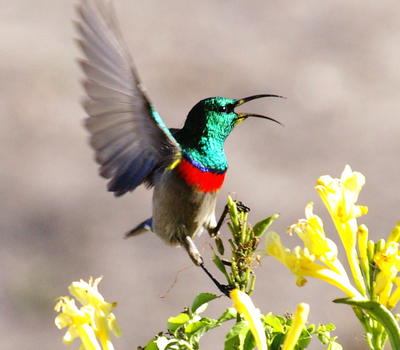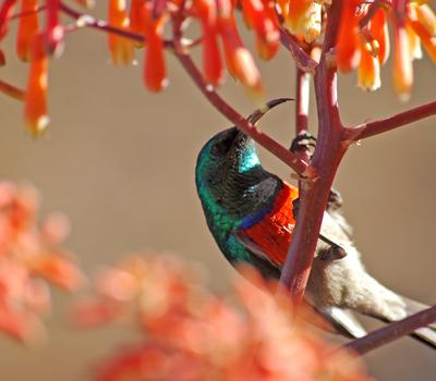 The beaks of the conspicuous endemic Orange-breasted Sunbird and the Southern Double-collared Sunbird are tailor-made for sipping the sweet stuff from the floral tubes of the various Erica species. You cannot miss the male Cape Sugarbird, with its ridiculously long tail (almost 70% of its total length), feeding on the nectar of Protea species. The impressive tail is solely a decorative testimony to manhood - the longer, the better! They whip their tails to attract females and ward off rivals.