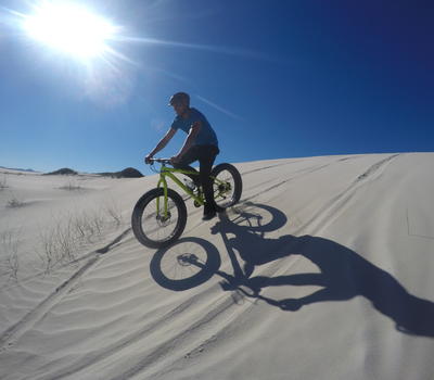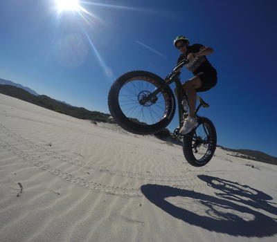 What your mind tells you is impossible will in fact be very enjoyable and easy. I will be at the bottom of the dunes videoing your challenges so remember to smile. I will also teach you how to do slalom like a skiier on a snow ski slope. This is excellent fun on a bike and not too difficult to achieve. After the dunes we will pick up a 4x4 trail down to the beach. From there we will head back up to the car park but for those who are already tired I can bring the 4x4 down to the rocks so you do not have to ride up.