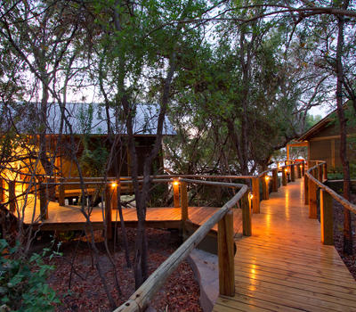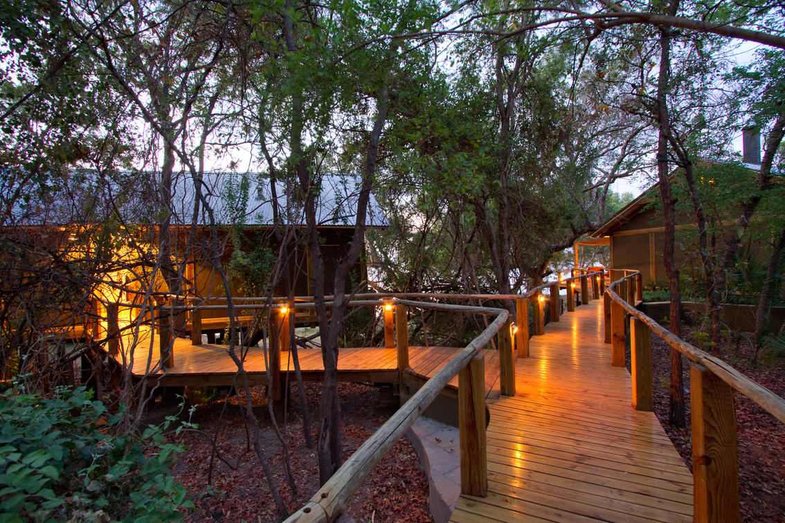 At the end of the swimming pool, a hidden path winds along the cliff face to our secluded Tree House. Set against the basalt rock bed, amongst the branches of a riverine Ebony tree, this house spreads out over a sustainable pine deck that guarantees incredible views of the Zambezi River.