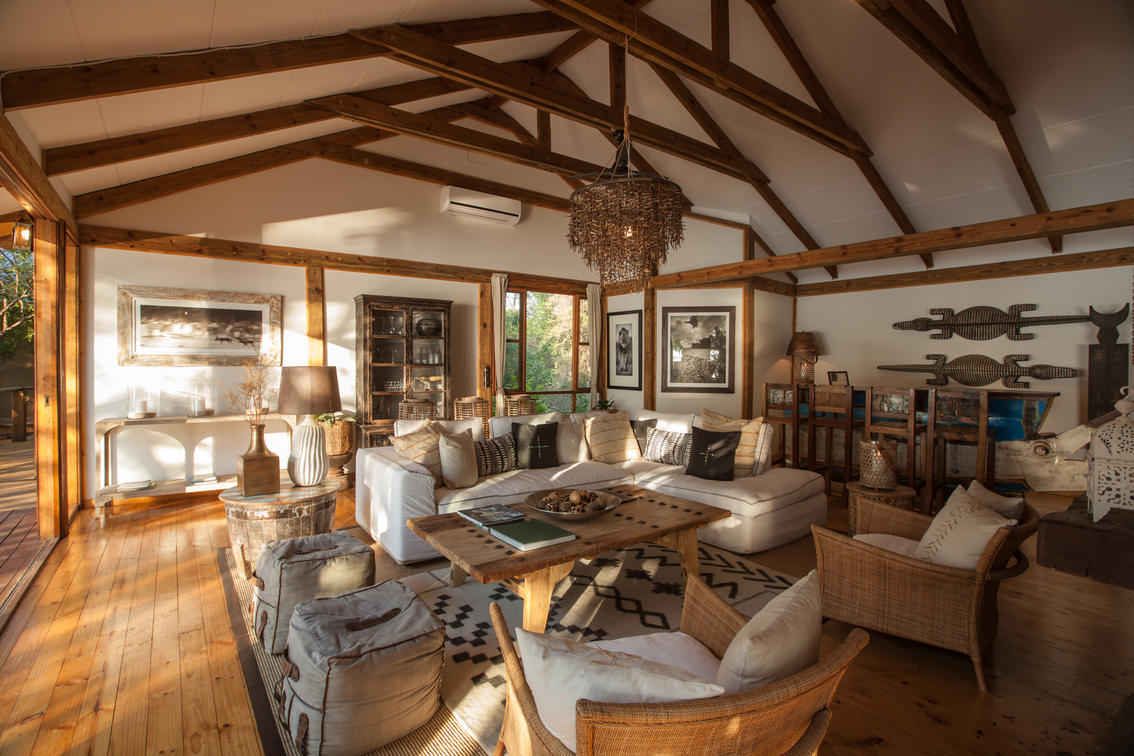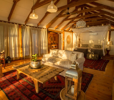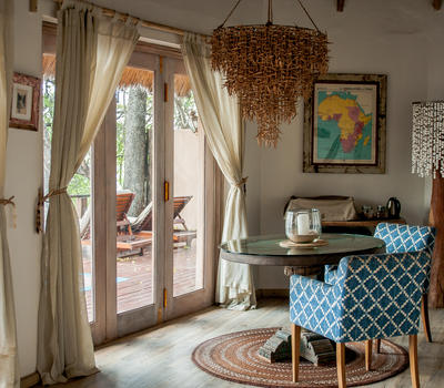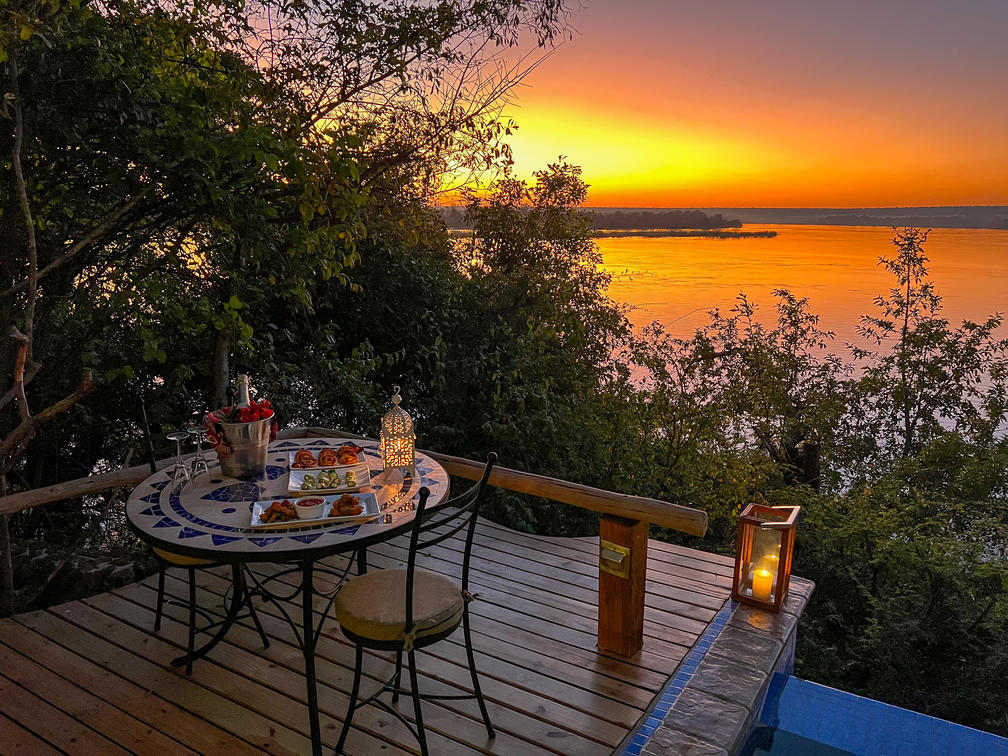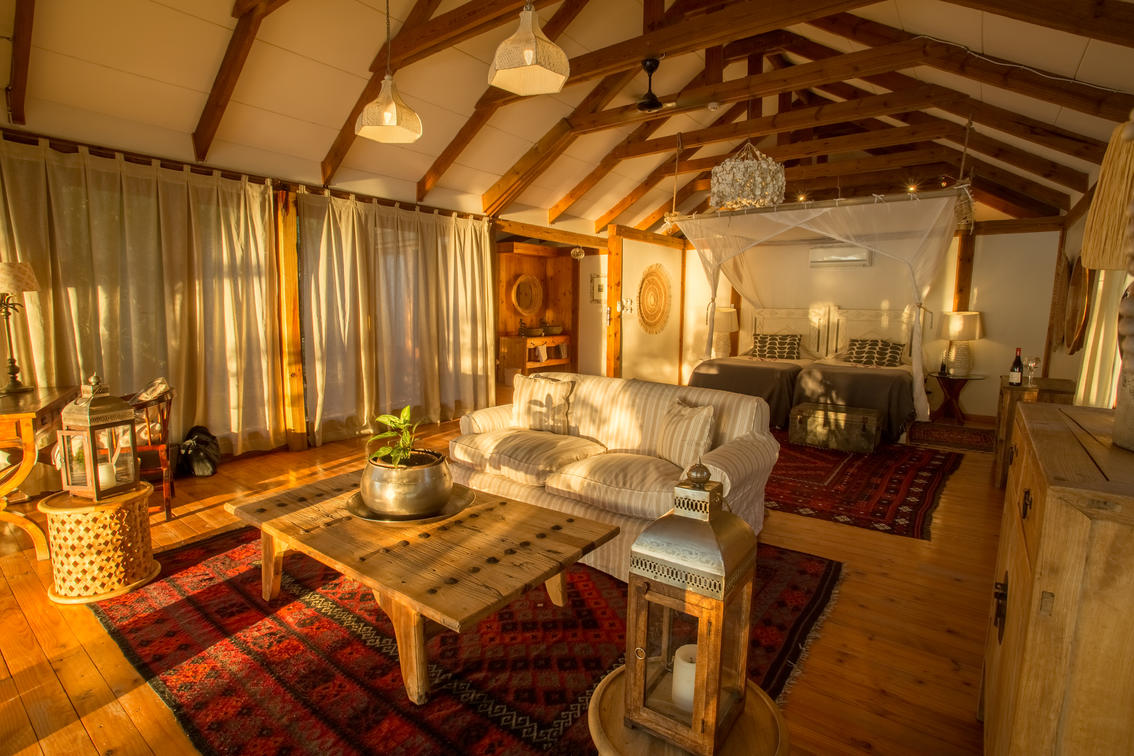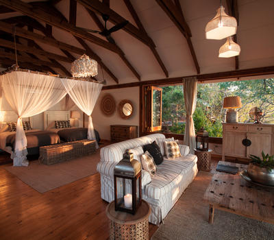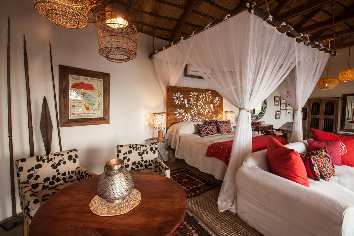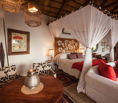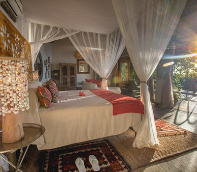 The Nut House is a haven from the elements. It is entirely enclosed but has light streaming in through every wall. The best art, textiles, and textures have been collected and combined from all around the African continent - from Morocco, Mali, Zambia, and South Africa just to start. This creates a lusciously romantic setting for relaxation, without losing an inch of the incredible river-view.