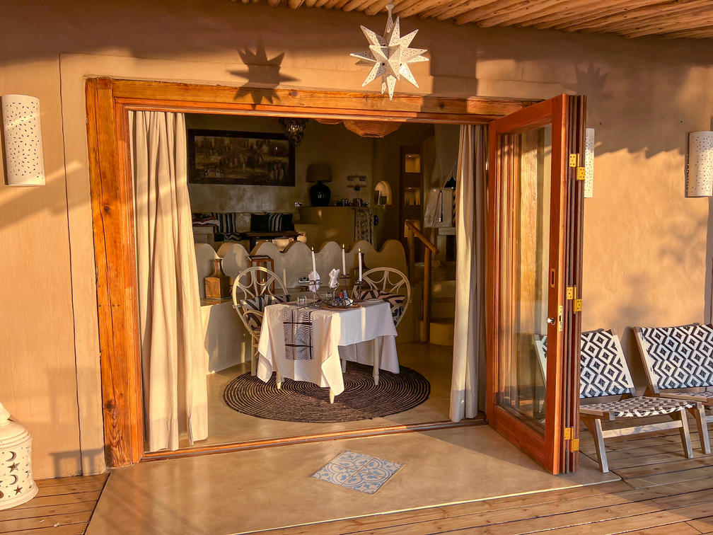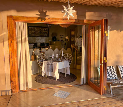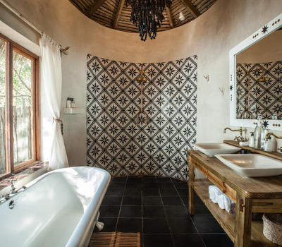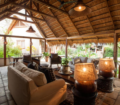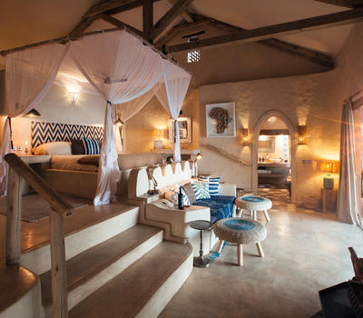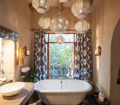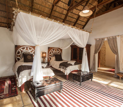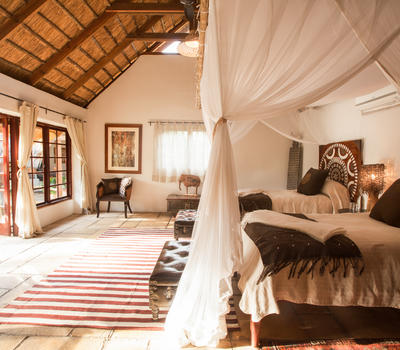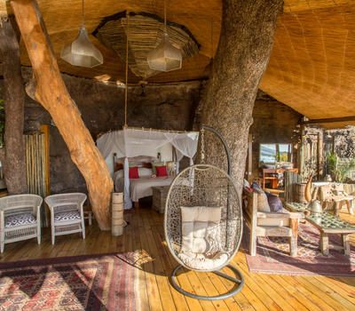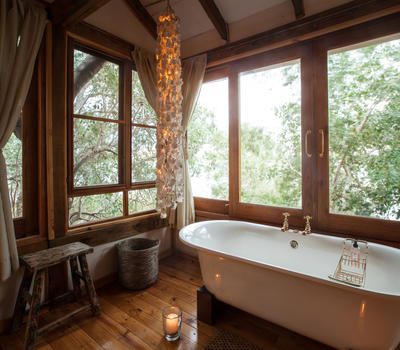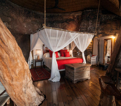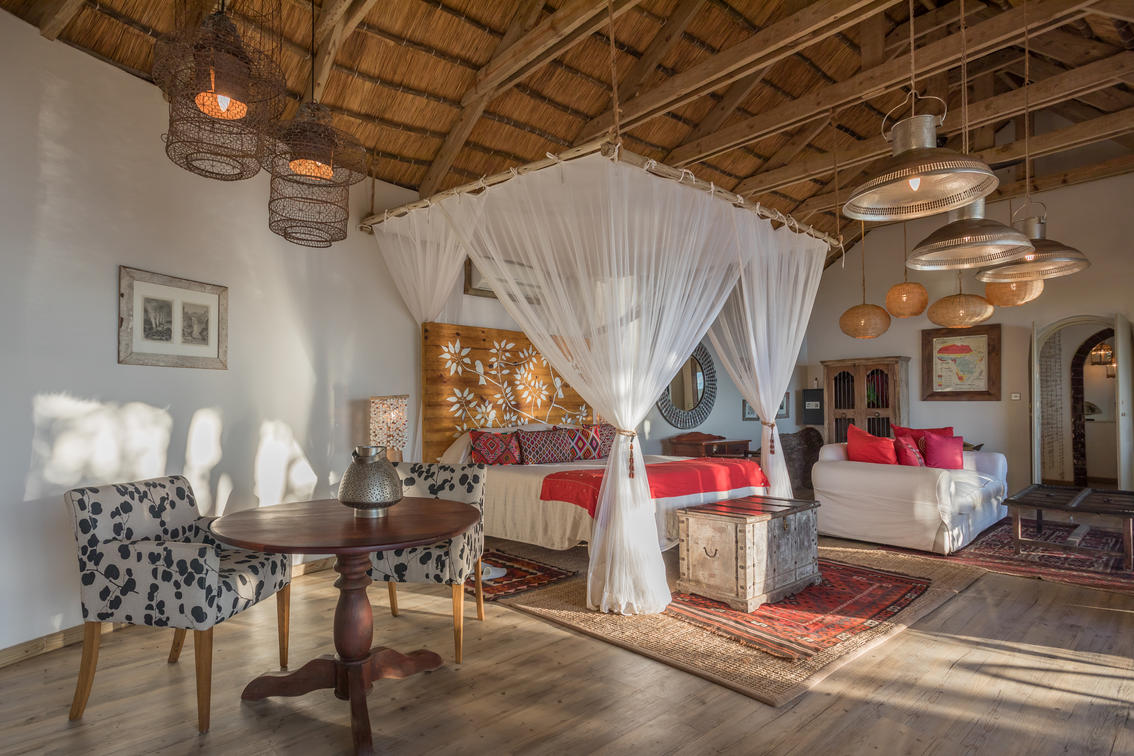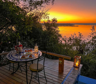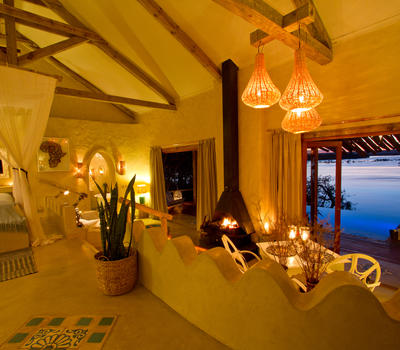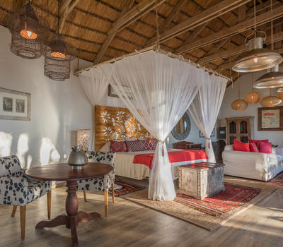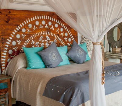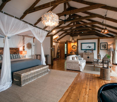 The Nut House is a haven from the elements. It is entirely enclosed but has light streaming in through every wall. The best art, textiles, and textures have been collected and combined from all around the African continent - from Morocco, Mali, Zambia, and South Africa just to start. This creates a lusciously romantic setting for relaxation, without losing an inch of the incredible river-view.