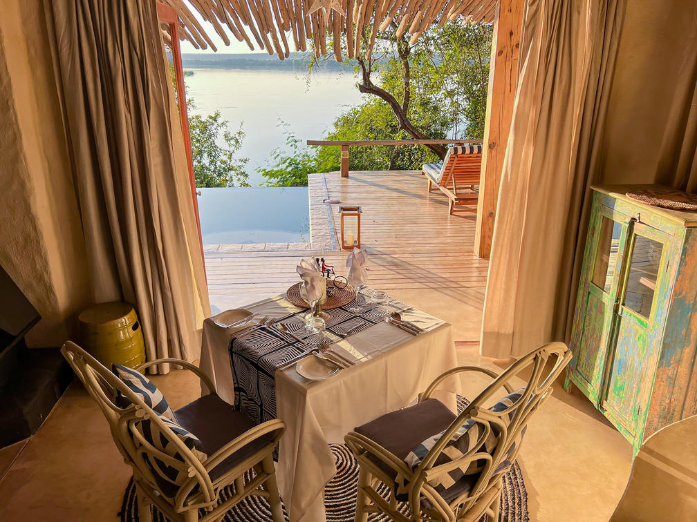 The palette is easy on the eyes, seamlessly blending the house into Zambia's natural scenery. Folding doors open onto the elevated private garden and infinity plunge pool. Spectacular views over the Zambezi are guaranteed.