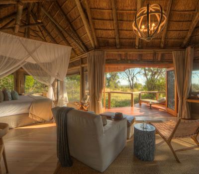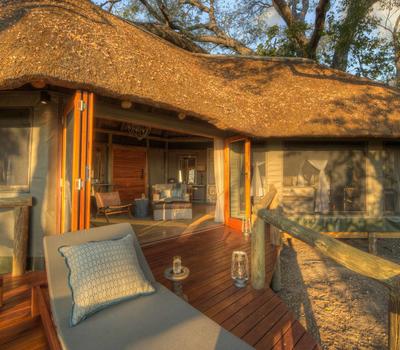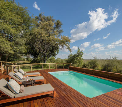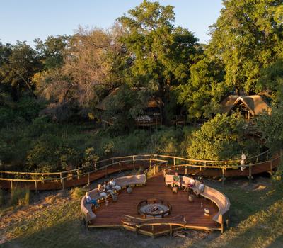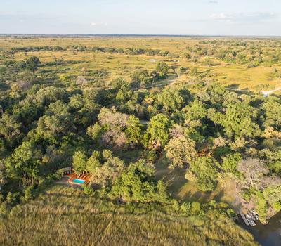 Aerial view of Camp Moremi on the edge of the Xakanaxa Lagoon