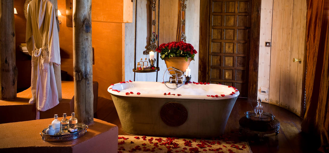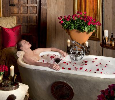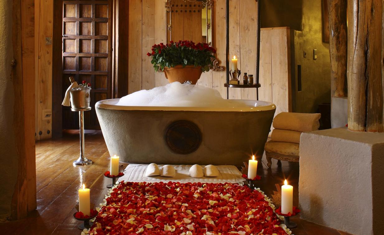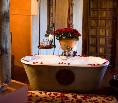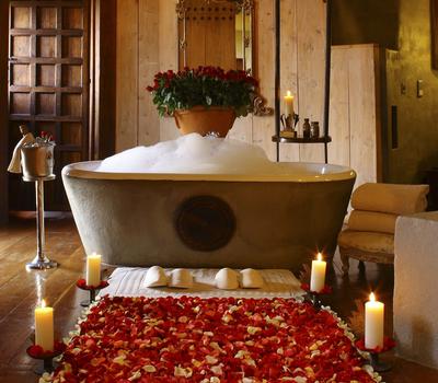With a centrepiece of red roses has twin hand basins, shower, chandelierlit bathtub and seperate wc