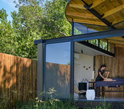 With panoramic windows and fold-back glass doors, allows guests to fully appreciate the natural setting.