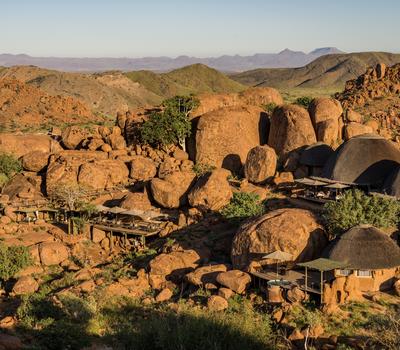 Aerial view over Mowani Mountain Camp's main areas and swimming pool