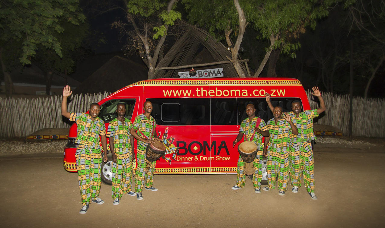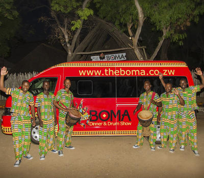 The Boma bus and the drummers at The Boma - Dinner & Drum Show