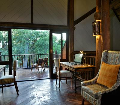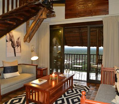 The Victoria Falls Safari Lodge’s king suites have an open plan lounge area with a guest toilet/ cloakroom downstairs as well as a private balcony. An open staircase leads up to the bedroom and en suite raised bathroom with a luxury bath and separate shower.