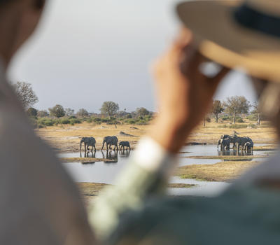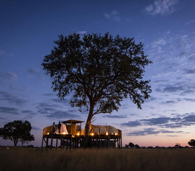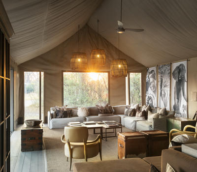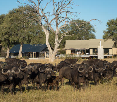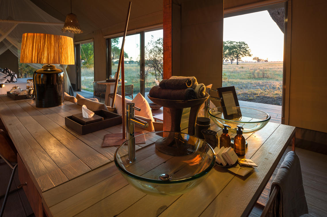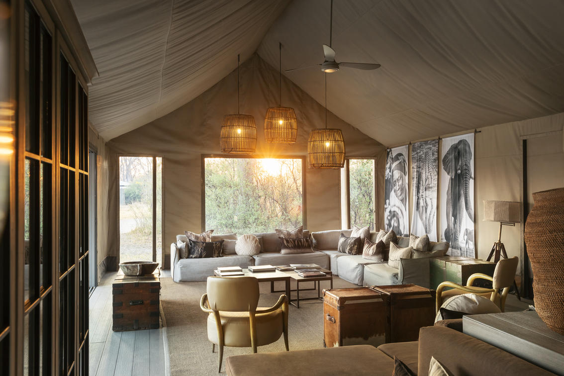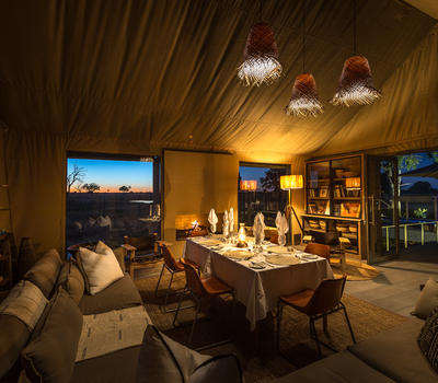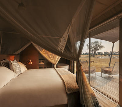 Shaded by leadwood trees, nine elegant tented suites offer views onto the camp’s waterhole and the busy plains beyond.