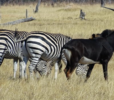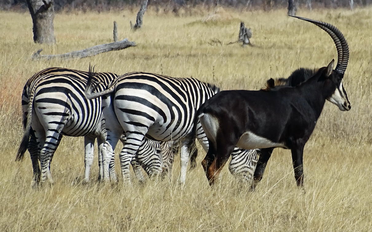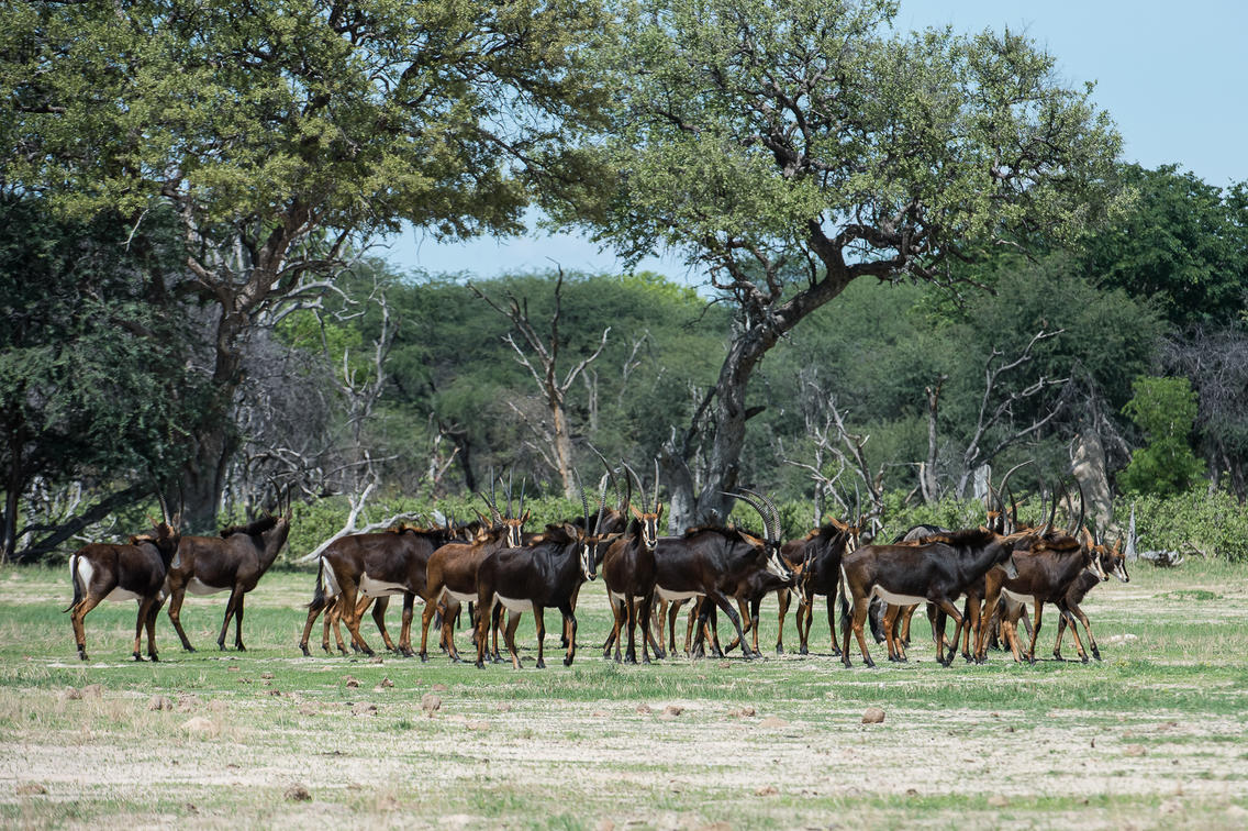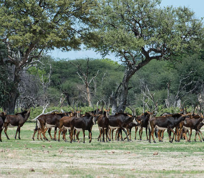 Herds of plains game including zebra and sable.