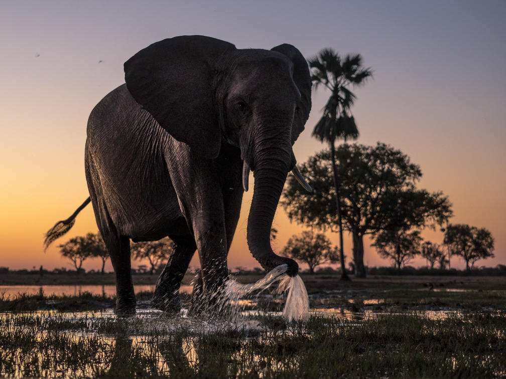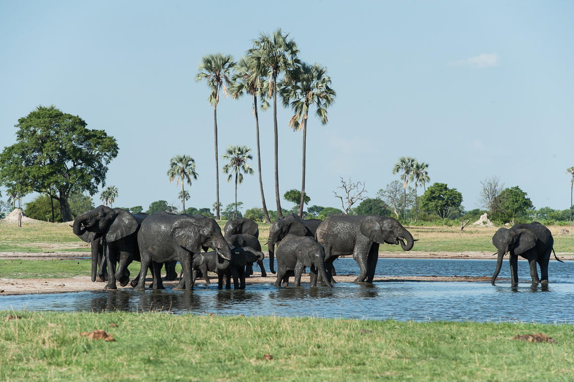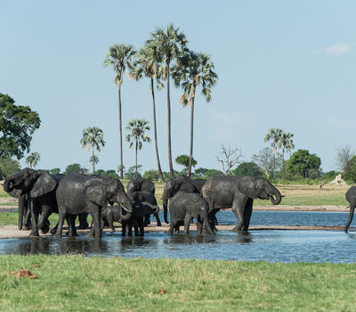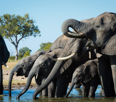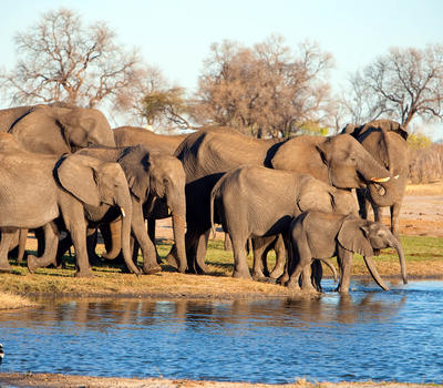 Elephants drink at a Hwange waterhole.