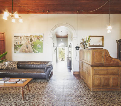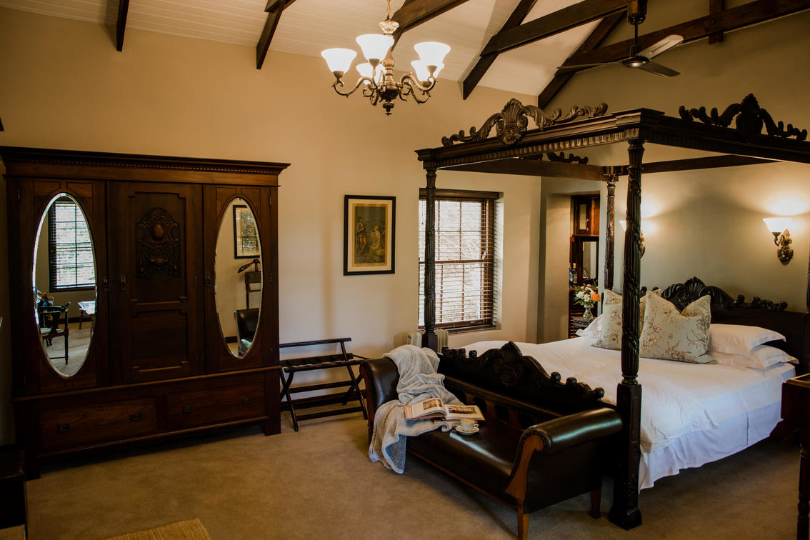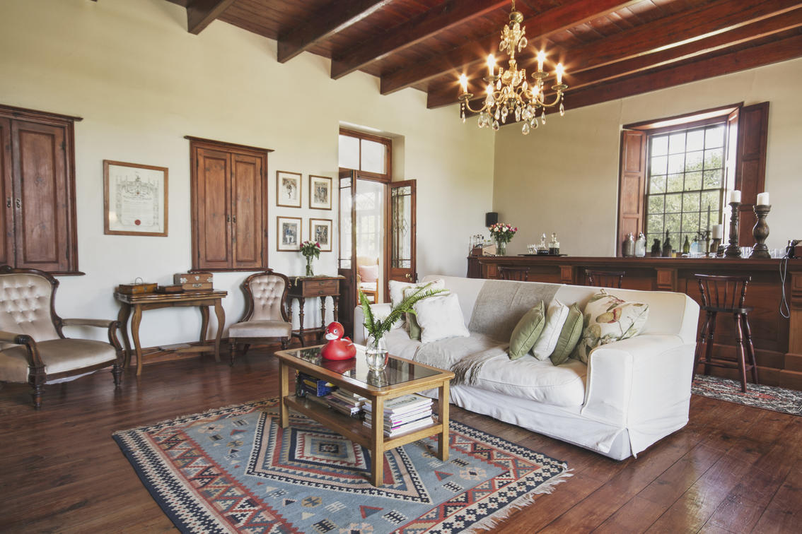 Keeping with the Victorian feel, an antique roll top desk, couch, yellowwood coffee table and a family picture commissioned from Alida diTekenar, a local Swellendam artist.
