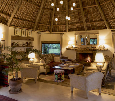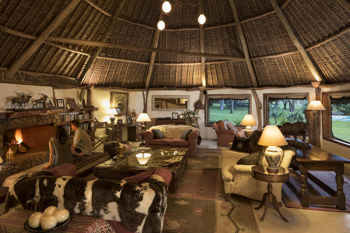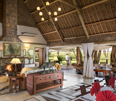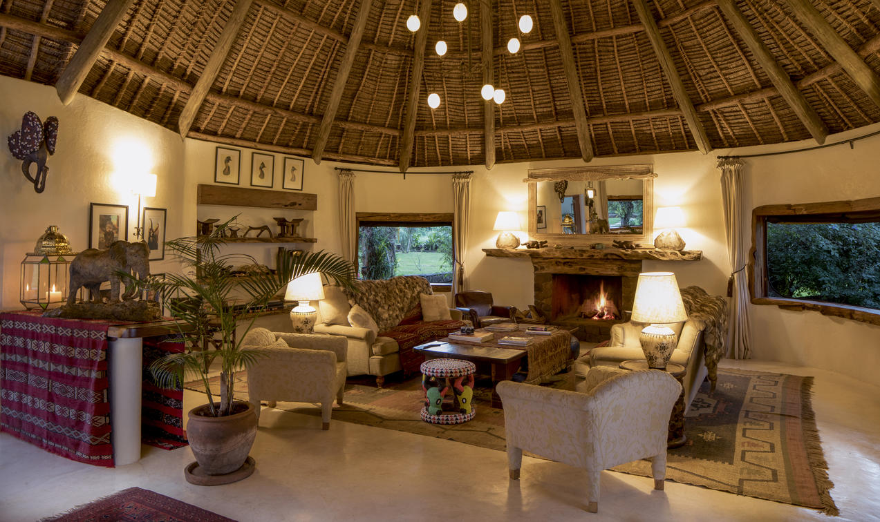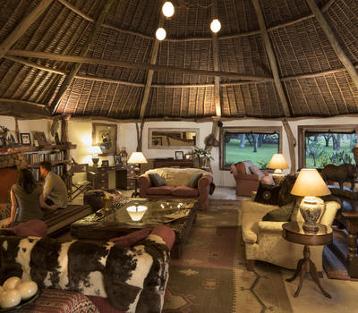 The Main Living area at Sirikoi Lodge is warm and eclectic, telling countless stories of a life lived on safari