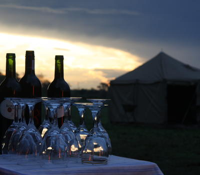 The camp is set up with a mess tent, which includes a dining table and buffet table, and a coffee station which is available all day. The table for lunch and dinner is prepared by our camp staff with porcelain plates, glasses for water and wine, and metal cutlery.